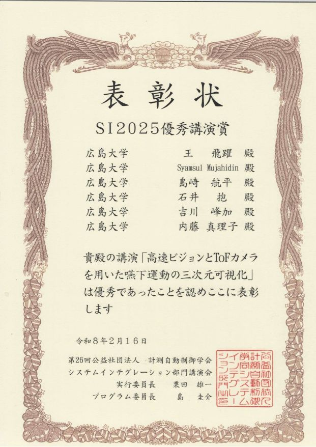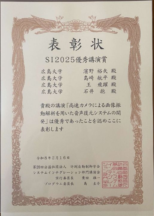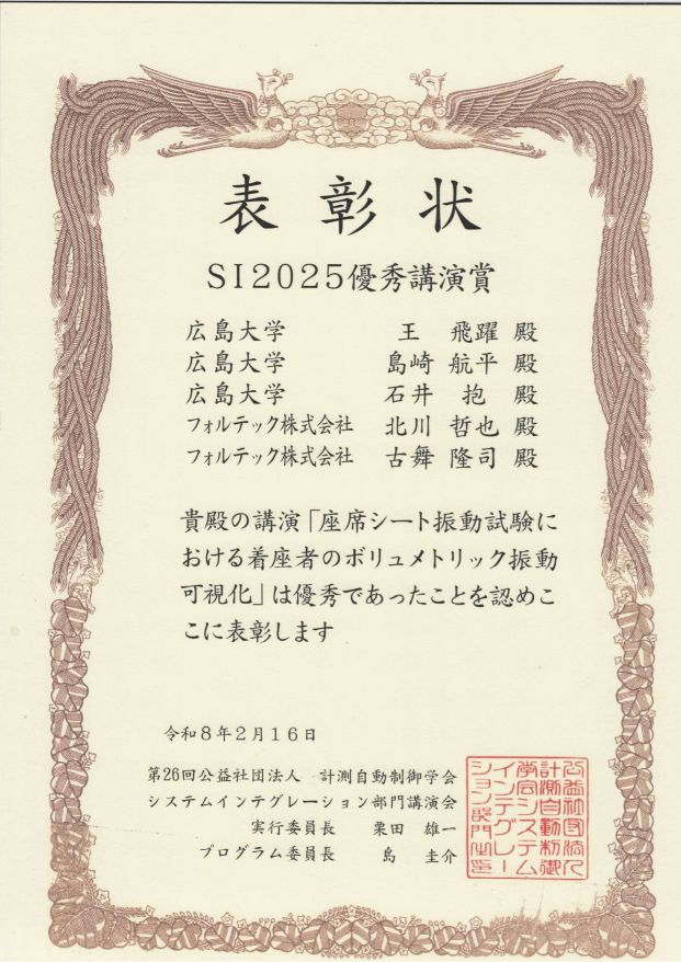 2026年2月16日「スマート検査・モニタリング」プロジェクトの研究員が、第26回公益社団法人 計測自動制御学会 システムインテグレーション部門講演会 で3つの優秀講演賞を受賞しました。受賞した講演は以下のとおりです。